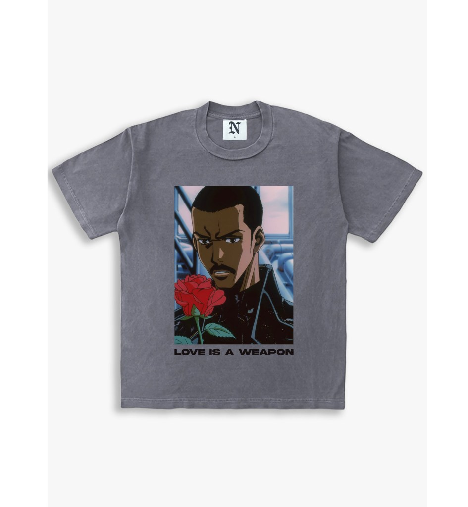 This pink graphic shirt features the ‘0049 Grey Love Is A Weapon’ design, combining modern style with bold expression.